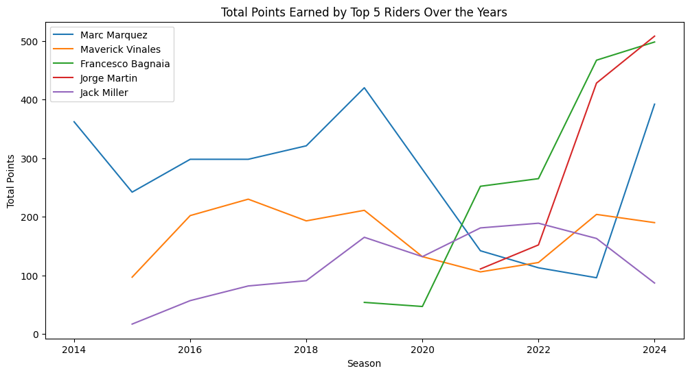 Vamos a analizar variables externas que explique el gráfico donde se observa que en los dos últimos años suben mucho los pilotos: Martín, Gagnaia y Marquez. Busca en internet noticias que puedan explicar el por qué de esta evolución. Dame los datos y las fuentes. Saca conclusiones.